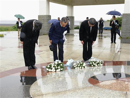 ※・写真=硫黄島平和記念墓地公園で献花する遺族代表(中央)ら=29日午後、東京都小笠原村(代表撮影)